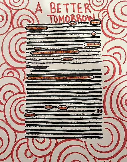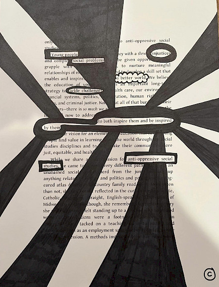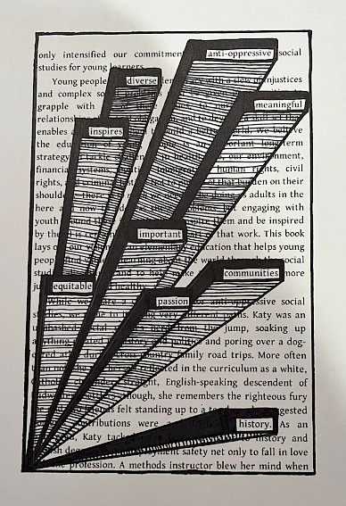 Teacher Educators Cara Ward (University of North Carolina Wilmington) and Elizabeth Bellows (Appalachian State University) asked their preservice teachers to use pages from SSFABW to create blackout poetry to represent their vision for teaching social studies. Behold their incredible work!